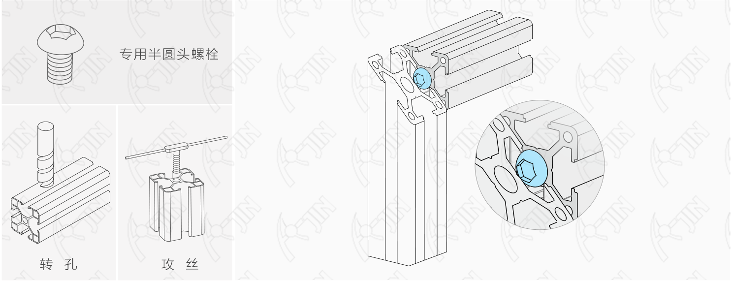 • 螺母的孔徑或螺栓的直徑需小于或等于型材槽寬