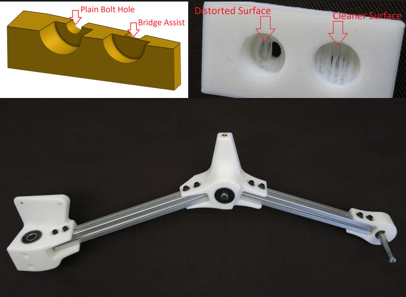 還有一點需要考慮的是,當(dāng)螺栓孔不能很好地與印刷床對齊時,會突出。我們可以通過創(chuàng)建覆蓋螺栓孔的薄層(2-3層高度厚)來幫助我們的打印機橋接奇怪的螺栓頭表面,該螺栓孔可以在用于其目的之后通過鉆機清理。與典型的打印支持解決方案相比,這些打印機更容易拆卸并消耗更少的材料。