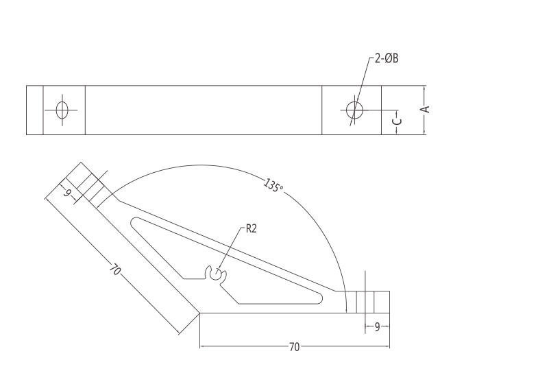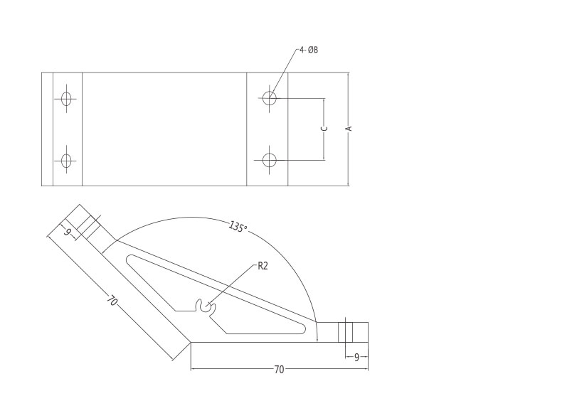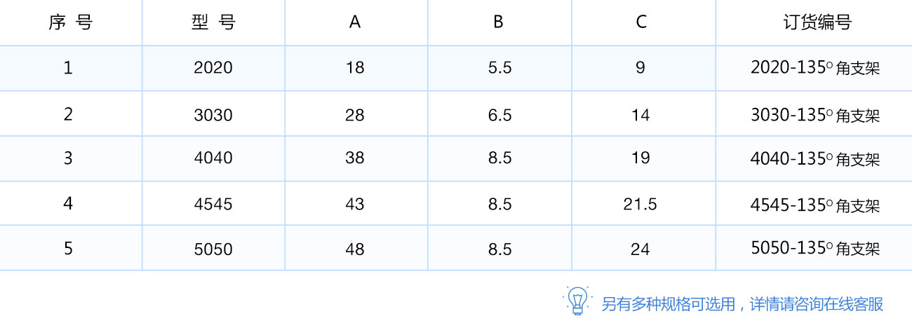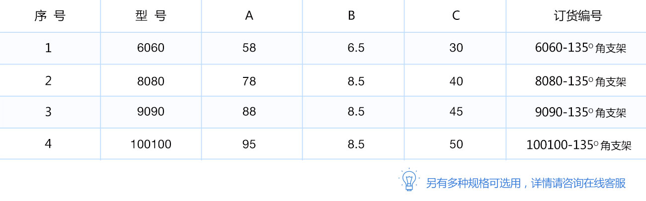 135度支架是從擠壓型材上截取料段,經(jīng)鉆孔加工而成。表面銀白陽極氧化(端面未氧化),連接強度高。靈活性和通用性能好,安裝簡單方便。主要用于型材的135度連接。