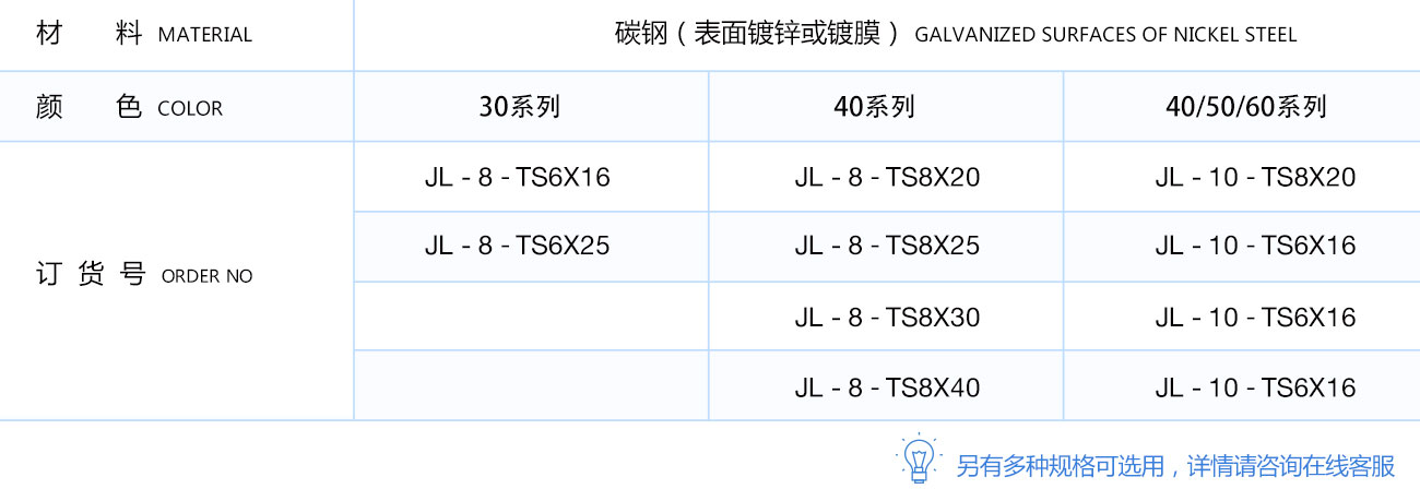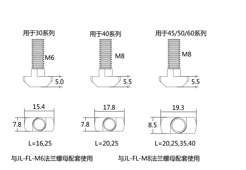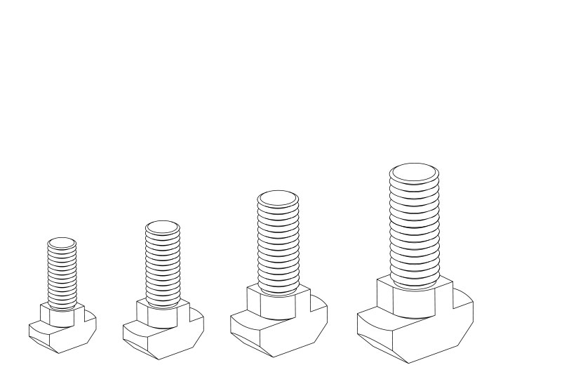 T型螺栓直接放入型材槽內(nèi),安裝過(guò)程中它能自動(dòng)定位鎖緊,常與法蘭螺母配合使用,是安裝角件等型材配件的好幫手。根據(jù)不同型材,槽寬及按準(zhǔn)過(guò)要求可選用不同規(guī)格及長(zhǎng)度的T型螺栓。